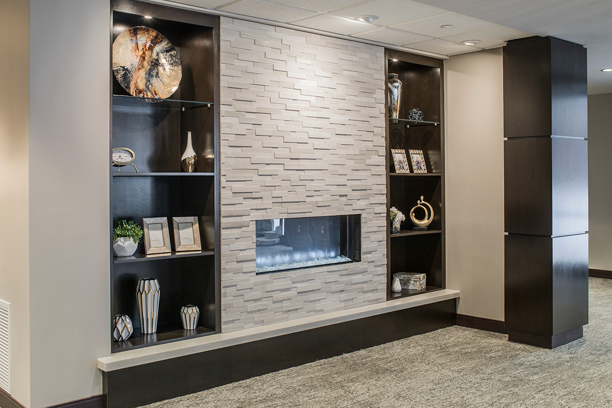 This project features fireplace bookcases and custom column enclosures found within the building’s main lobby, all stained in cherry wood. The column enclosures include both vertical and horizontal reveals. We also built a custom reception desk for the lobby entrance, finished in the same stained cherry wood. A final piece located off the lobby is a custom mail sorting counter/desk.